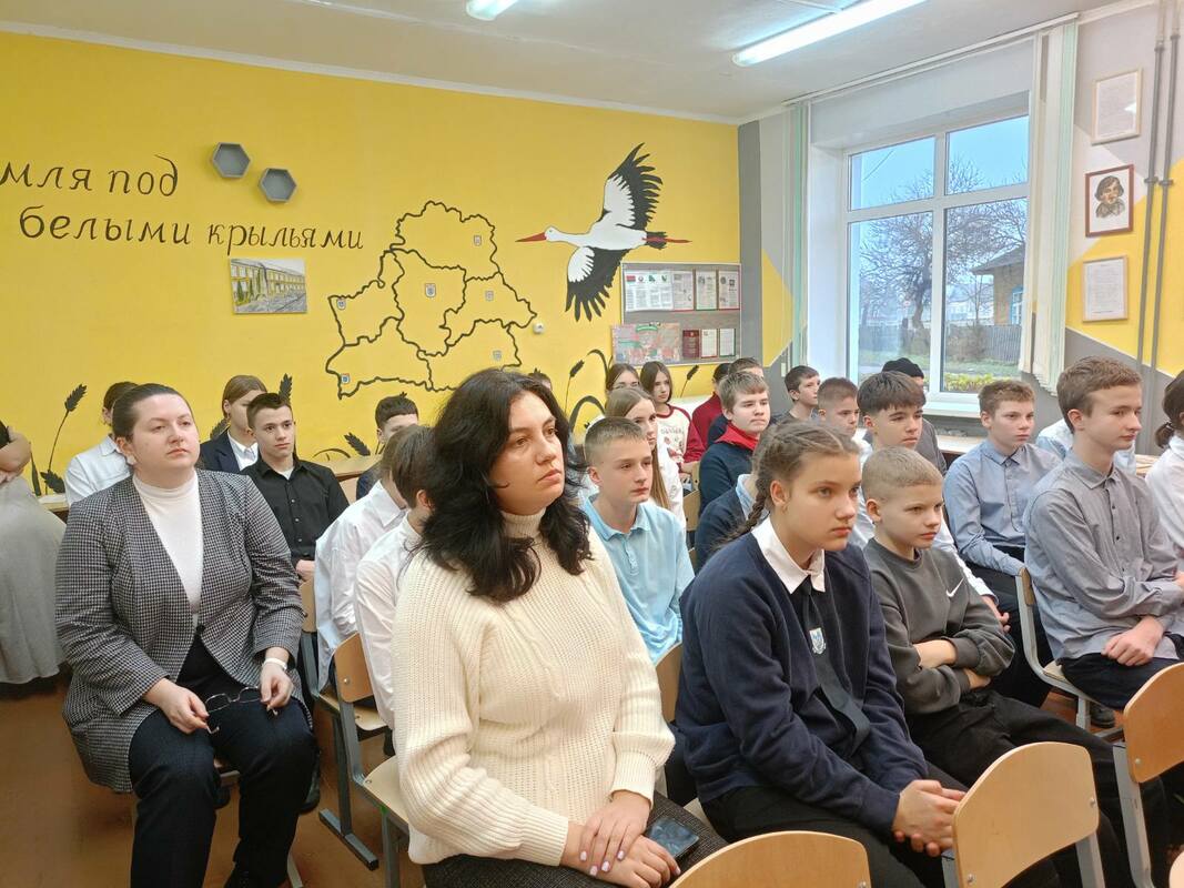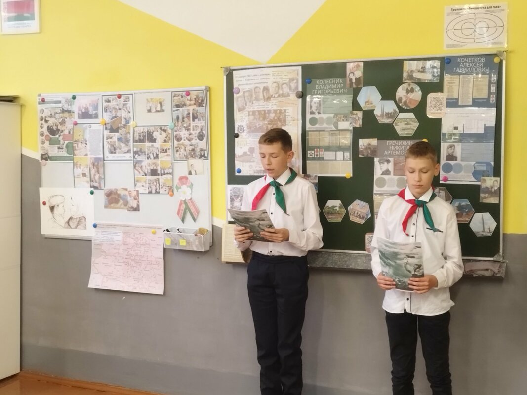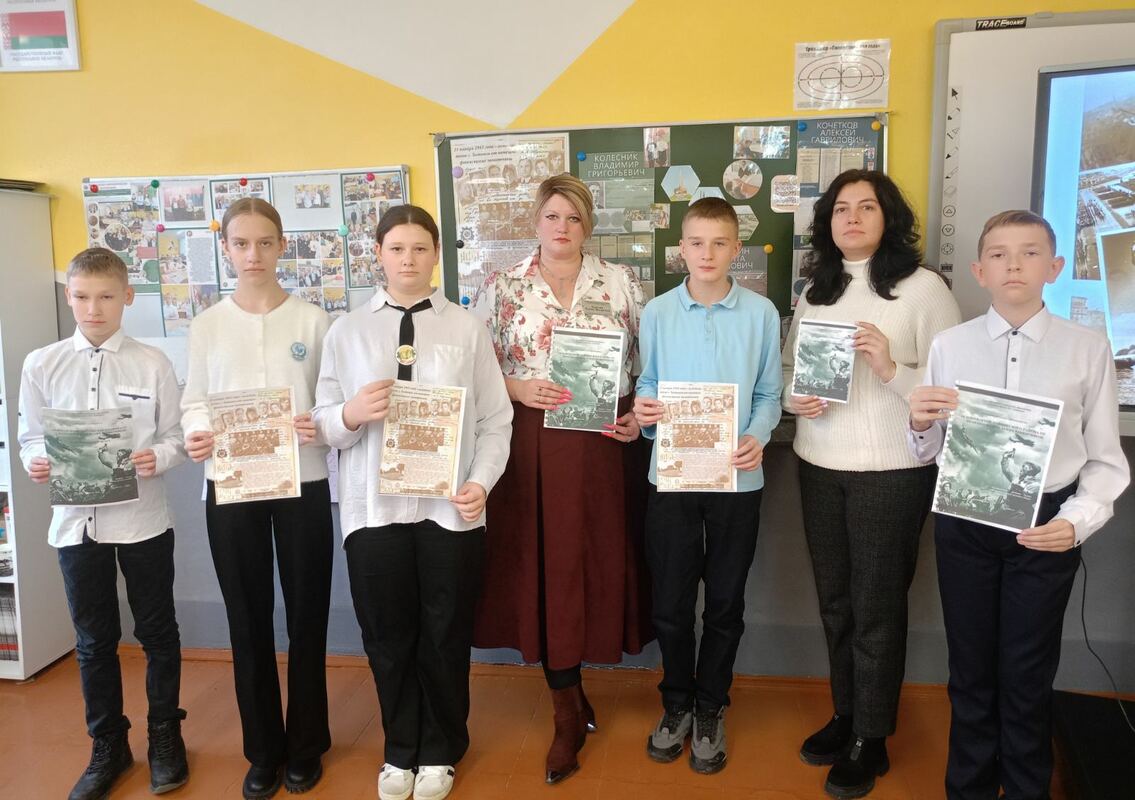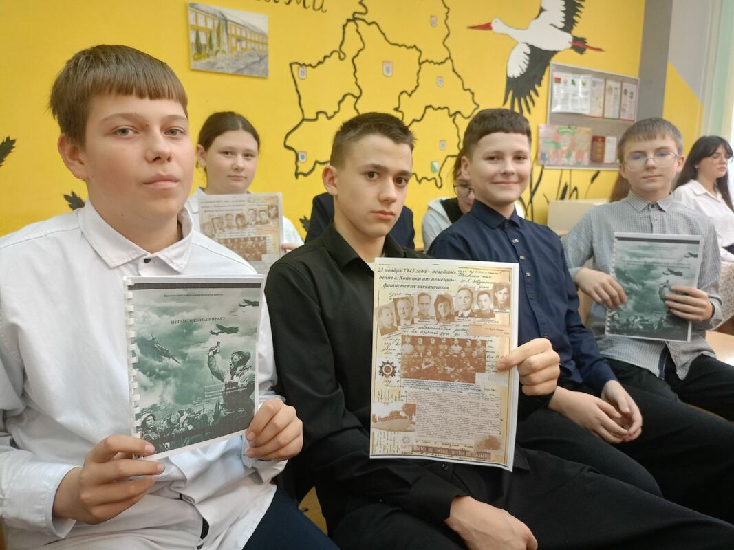 По уже сложившейся доброй традиции наша школа в эти памятные дни радушно принимала гостей — учащихся городской гимназии и третьей школы. Для ребят 7-9 классов состоялось торжественное мероприятие, посвящённое Дню освобождения города Хойники от немецко-фашистских захватчиков. Программа была очень насыщенной и трогательной: мы соприкоснулись с суровой историей: узнали о судьбах настоящих людей, расстрелянных в те страшные годы. С большим вниманием были заслушаны исследовательские работы учащихся. Особенно проникновенными стали выступления семиклассников, которые декламировали и инсценировали стихи о войне. К ним присоединился и учитель, организовавший мероприятие, прочитав одно из лучших стихотворений о войне. В память о павших героях была объявлена минута молчания.