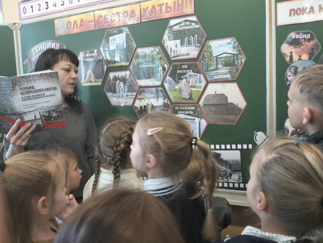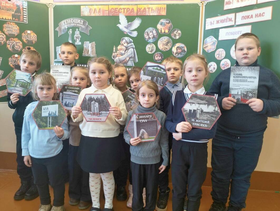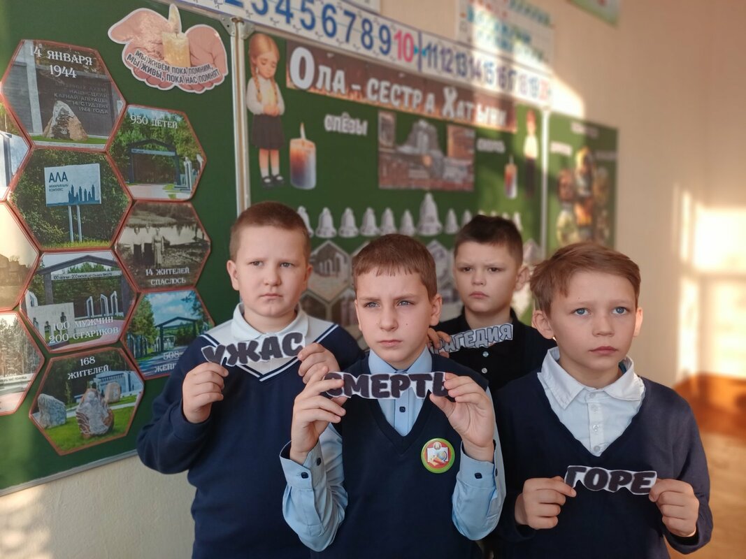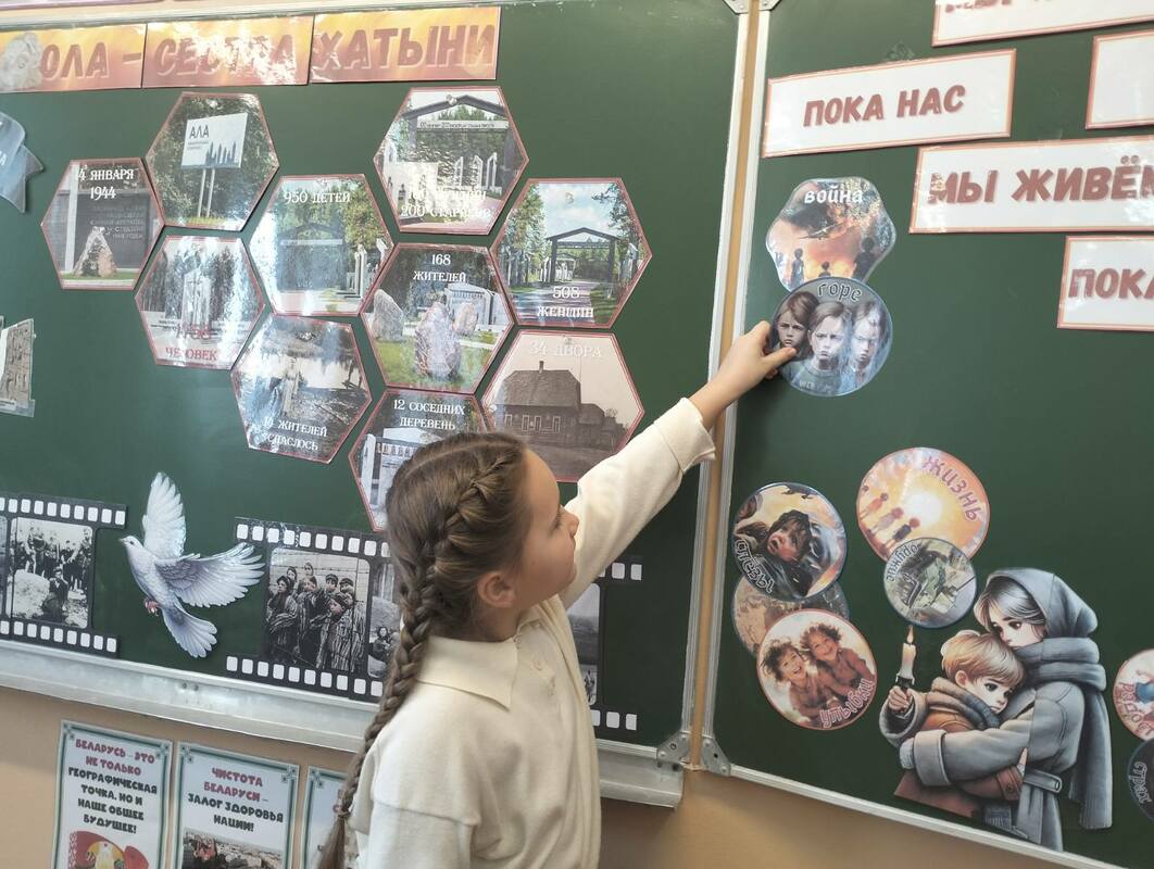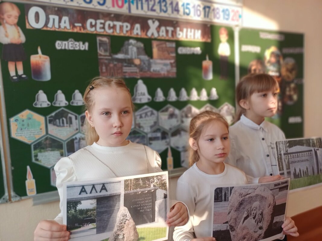 Сегодня во всех классах прошёл единый урок «Ола — сестра Хатыни». Недавно ребята сами стояли на пепелище, дышали тишиной мемориального комплекса, трогали камни, видели имена.