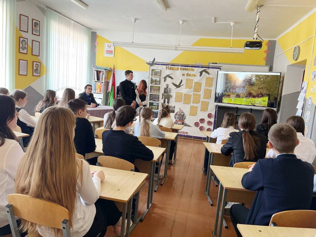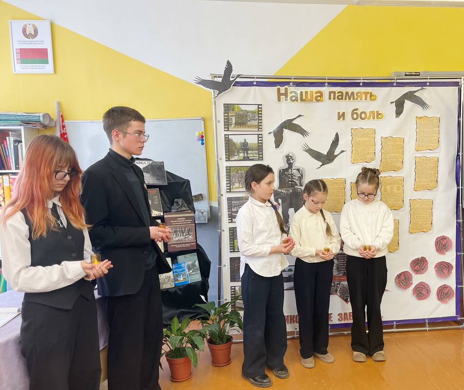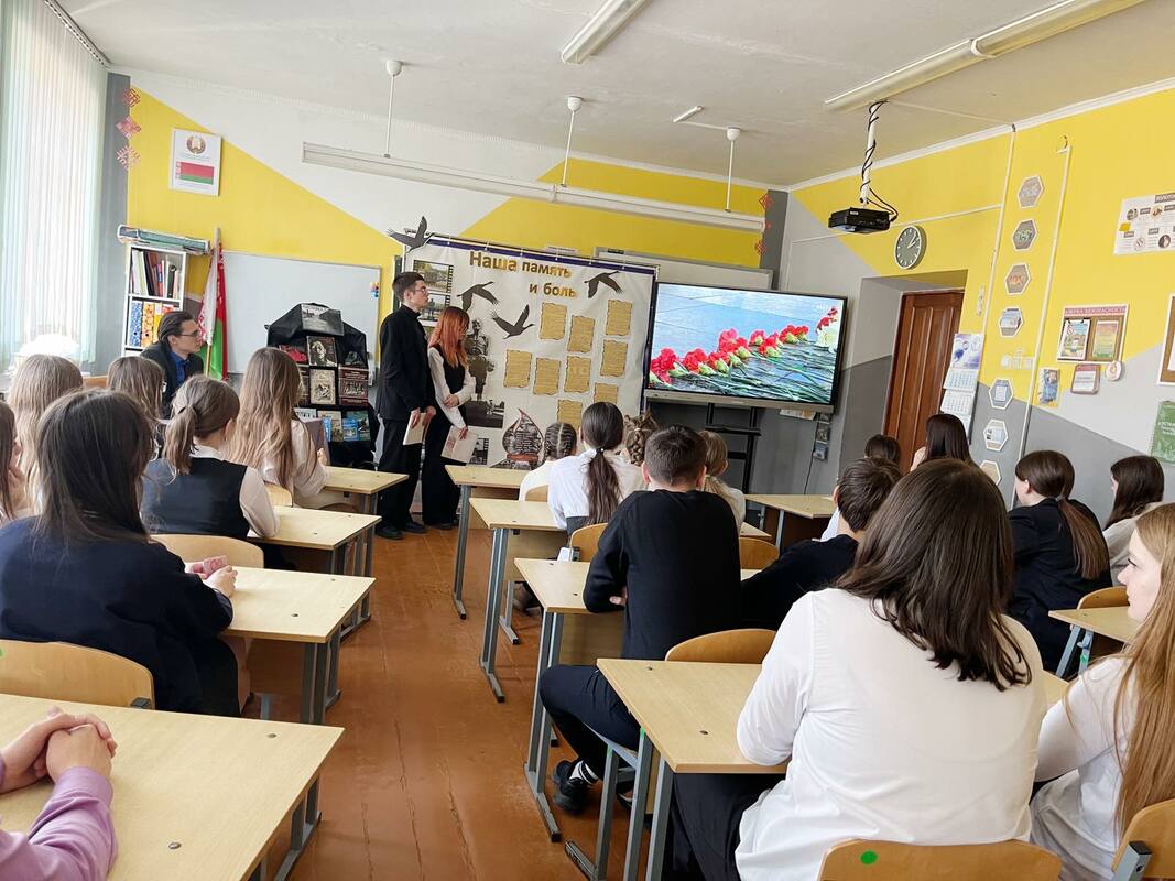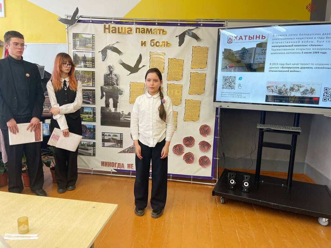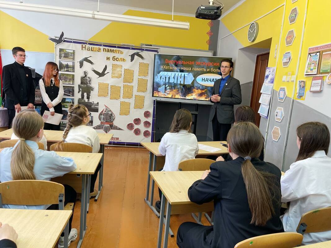 Сегодня для учащихся нашей школы прошел единый урок, посвящённый трагедии Хатыни. Ребята прошли трудный, но важный путь осознания трагедии, произошедшей 22 марта 1943 года.В ходе занятия были просмотрены документальные кадры государственной хроники, звучали проникновенные стихи, посвященные сожженным деревням. Кульминацией урока стала виртуальная экскурсия по мемориальному комплексу «Хатынь». Учитель истории, Смольский Владимир Михайлович, помог ребятам увидеть символизм каждого элемента этого скорбного места — от «Кладбища деревень» до скорбных труб-обелисков, оставшихся на месте домов.